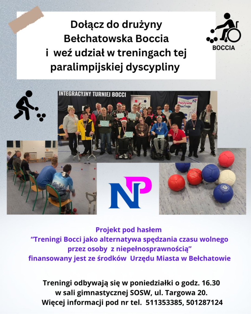 Zachęcamy mieszkańców Bełchatowa do dołączenia do naszej drużyny w ramach projektu ,,Treningi Bocci jako alternatywa spędzania czasu wolnego dla osób z niepełnosprawnością”.